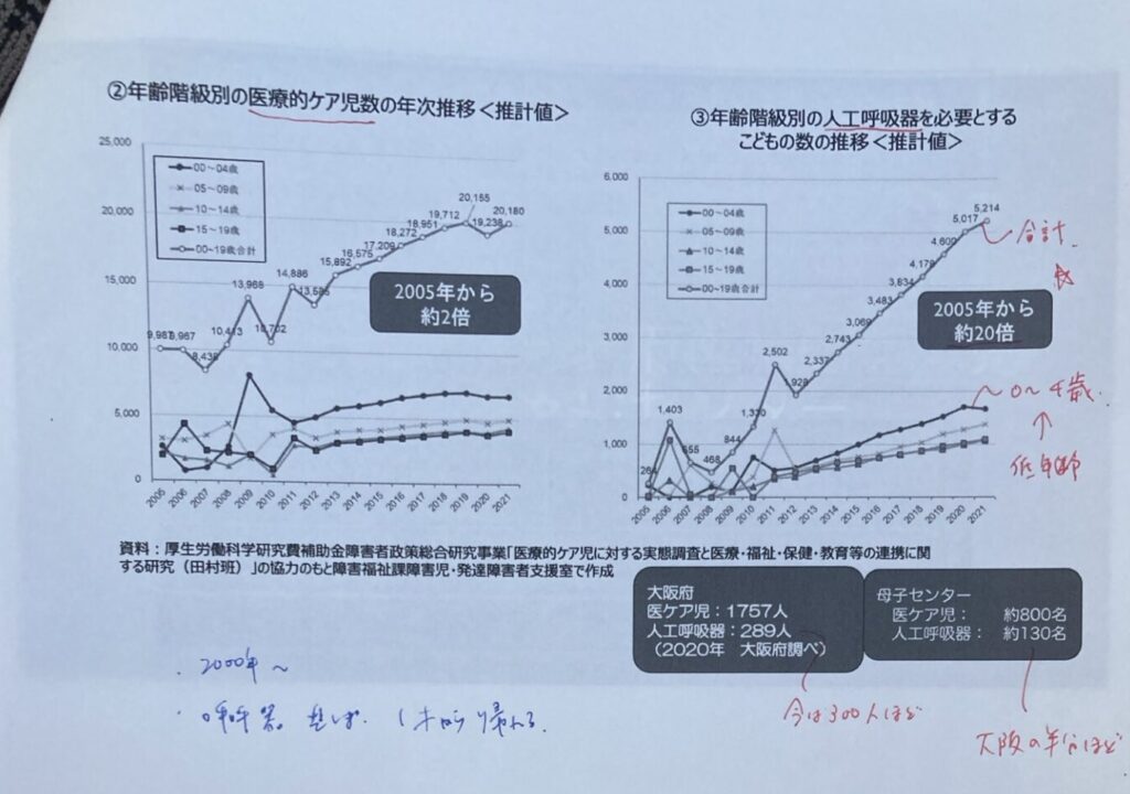 大阪府では、人工呼吸器や経管栄養などの医療的ケアを必要とする子どもが2005年から約2倍に増加。