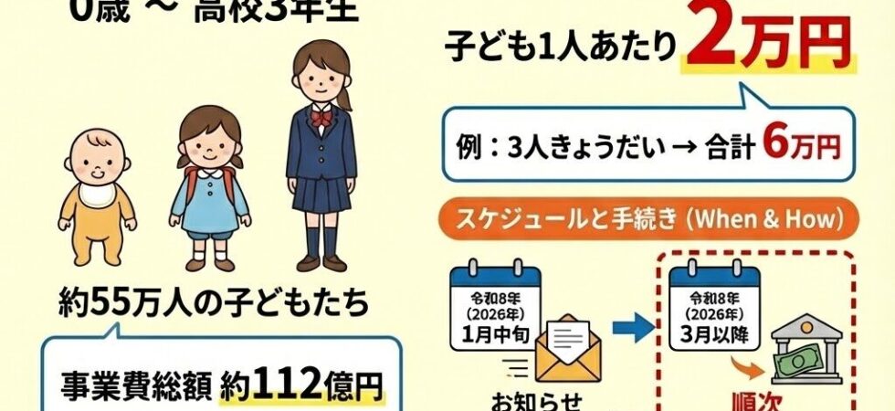 2025年12月18日に、横浜市会で「子育て世帯への緊急支援給付金」 … 続きを読む 【決定】横浜市「0歳〜高校3年生まで」子ども1人あたり2万円の給付はいつ?(3月上旬から)