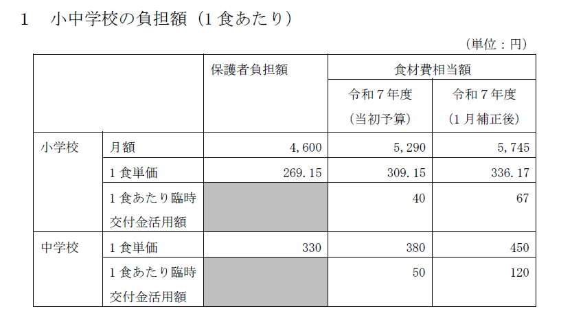 「小学校は無償化へ」「中学校は保護者負担330円/食を据え置き(値上げ回避)」という方向性です。