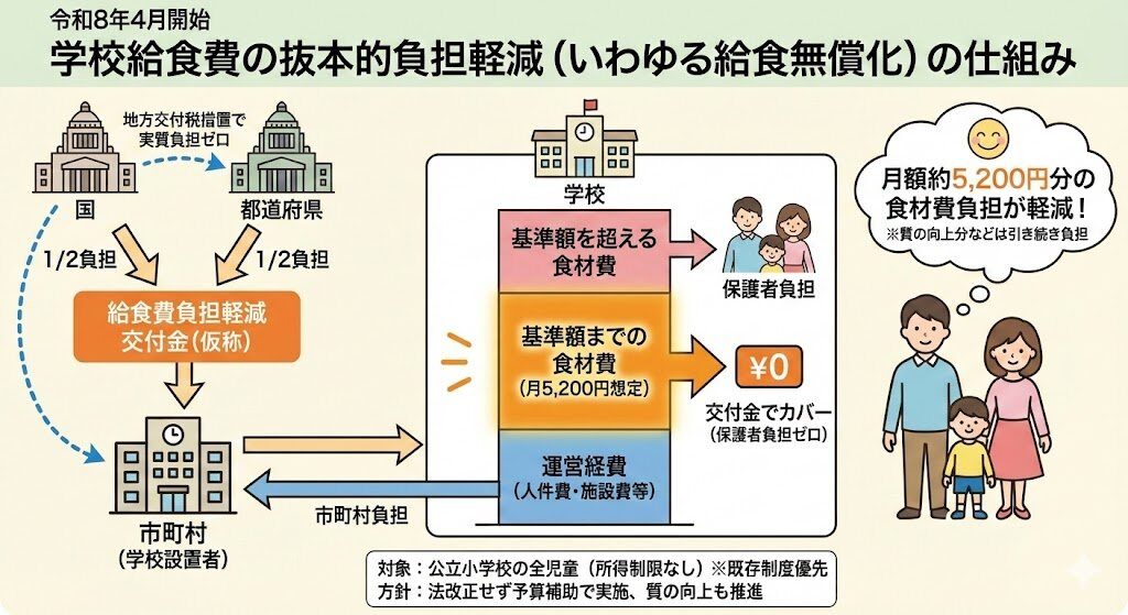 国の制度としては、**“給食費の抜本的負担軽減(いわゆる無償化)”**を進める枠組みが示されています。