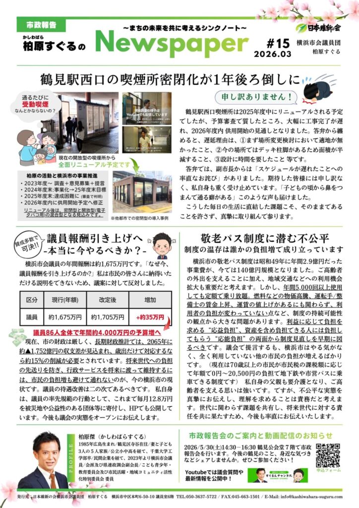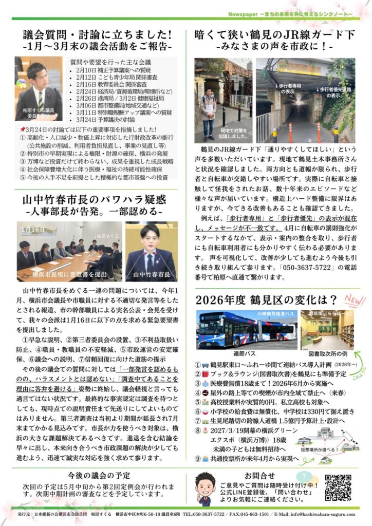 【2026年3月号】市政レポート~予算審査はどうだった?鶴見区の変化や議員報酬アップ議案、市長パワハラ疑惑への対応も~
