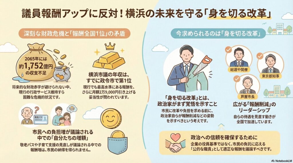 第三に、政治家としての姿勢の問題です。 全国で「まず自ら覚悟を示す」動きが広がる中、横浜市が逆の方向に進むことは、政治への信頼を損ないかねません。