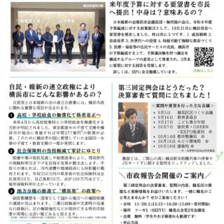 0 blog / お知らせ(トップ) / レポート / 市政報告 2025年11月10日 【2025年11月号】市政レポート~決算審査や予算要望どうだった?自民と維新の連立政権の影響は?~ こんにちは。柏原すぐる(横浜市会議員・鶴見区選出)です。 「柏原すぐ...